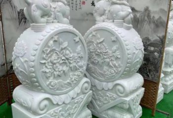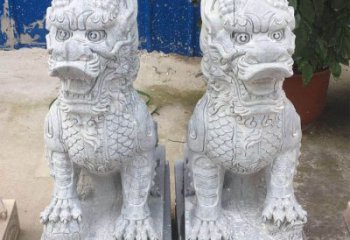 放在門口左側的雄獅一般都雕成麒麟雕塑玩弄繡球或者兩前爪之間方一個繡球張嘴型。門口右側雌獅則雕成左前爪撫摸幼獅或者兩前爪之間臥一幼獅。